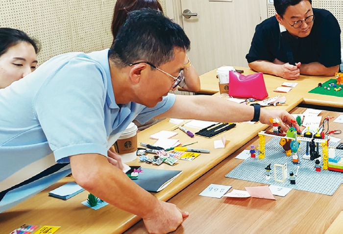 개인별 모델 제작 뒤 워크숍은 마지막 단계로 이어졌다. 마지막 단계는 각자가 만든 레고 모델을 ‘열정’ ‘자신감’ ‘도전정신’ ‘지혜’ ‘정보’ 등 각 ‘성공 요소’로 분해하는 데서 시작했다. 이어 참가자 전원이 돌아가면서 이 성공 요소들을 결합해 ‘하나의 큰 모델’을 만들었다.