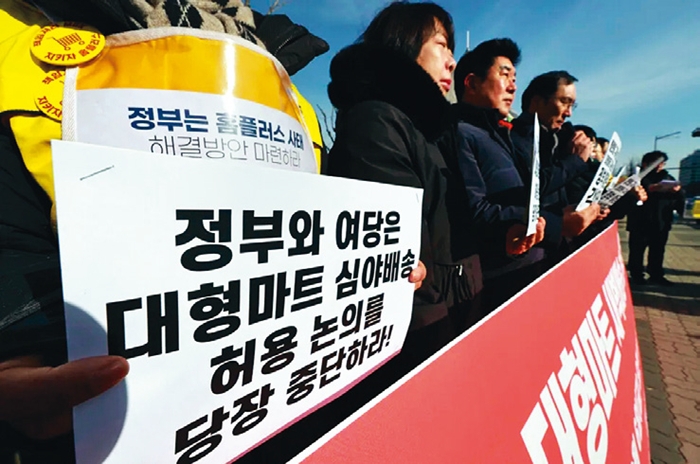 지난 6일 서울 여의도 국회 정문 앞에서 한국중소상인자영업자총연합회, 마트산업노동조합, 참여연대 민생희망본부 등이 연 기자회견에서 참석자들이 대형마 트 새벽배송 허용을 추진하는 정부와 여당을 규탄하고 있다. 연합뉴스
