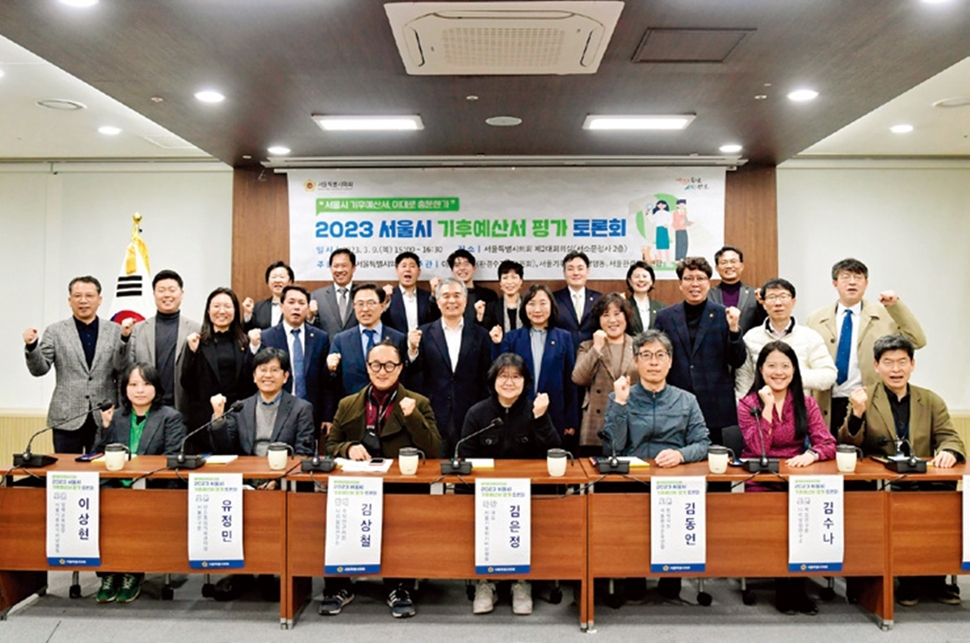 이영실 서울시의원(더불어민주당·중랑1) 주관으로 2023년 3월9일 서울시의회 제2대회의실에서 서울기후위기비상행동 및 서울환경운동연합과 공동으로 열린 ‘2023 서울시 기후예산서 성과 평가 토론회’ 뒤 참석자들이 기념사진을 찍고 있다. 이영실 시의원 제공