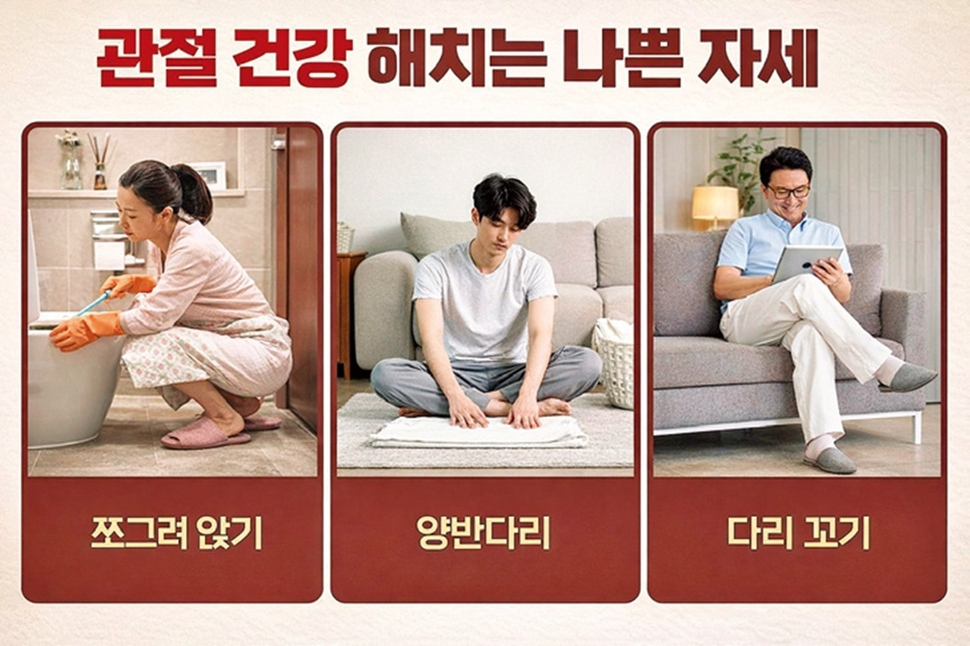 문제가 되는 또 다른 자세는 바로 무릎을 끌어안고 앉아 있는 것이다. 필자의 경험에 따르면 여성들이 이 자세를 취하는 경우가 많다. 식탁에서 식사할 때나 바닥에 앉아 티브이(TV)나 노트북을 사용할 때 가장 많이 나타난다. 이 자세 또한 마찬가지로 고관절이 지속적으로 굴곡돼 골반이 전체적으로 뒤로 말린 형태가 유지된다. 이로 인해 허리뼈와 등뼈는 당연히 말릴 수밖에 없는 구조가 되고 머리는 몸의 중심을 앞으로 유지하기 위해 고개를 앞으로 쭉 내밀게 돼 흔히 말하는 거북목이 될 가능성이 매우 커진다.