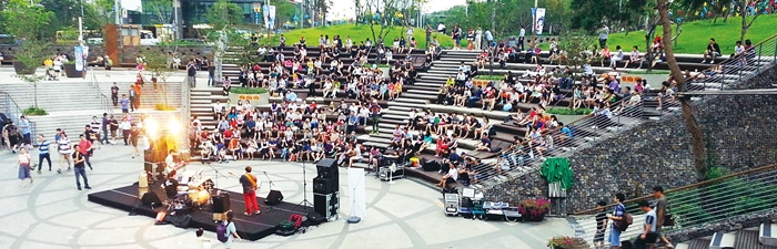 4시가 되자 광장이 술렁거렸다. 둥그렇게 벤치로 둘러싸인 광장 가운데에서 감미로운 목소리와 세련된 기타 선율이 울려퍼졌다. 네이버 뮤지션 리그에 소개되기도 한 어쿠스틱 듀오 ‘아봉’이 공연을 시작했다. ‘자신감’ ‘선물’ ‘안 만날 거야’ 등의 자작곡과 자우림의 ‘샤이닝’, 나르샤의 ‘아임 인 러브’, 김건모의 ‘첫인상’ 등 유명한 곡들을 들려줬다.