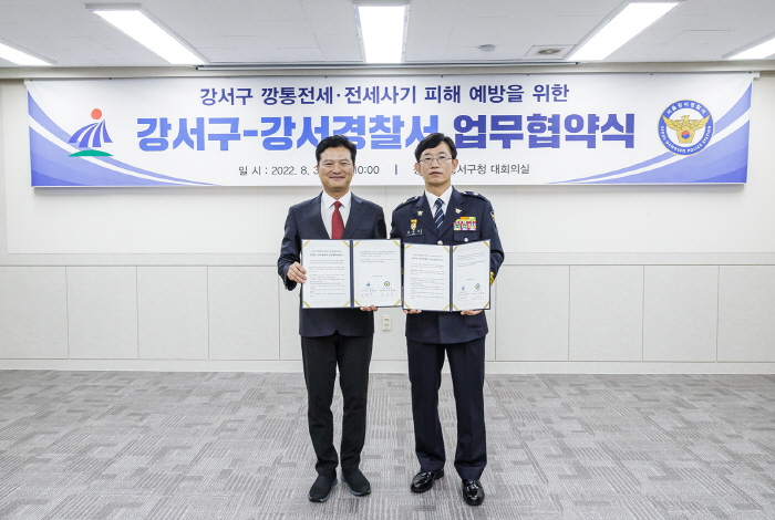 지난 31일 진행된 협약식에서 김태우 강서구청장과 김원태 강서경찰서장이 기념사진을 찍고 있다. 강서구청 제공