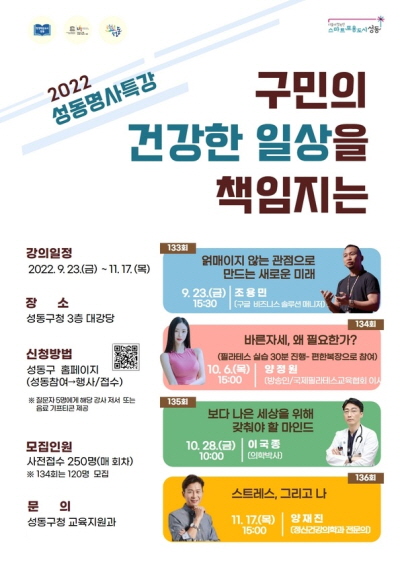 구 관계자는 “성동명사특강은 사회저명인사가 들려주는 삶의 지혜, 자기계발, 인생 동기부여 특강으로 2008년부터 지금까지 모두 132회 진행됐다”며 “이번엔 ‘시대를 살아가는 힘-지식건강·몸건강·정신건강’을 주제로 사회저명인사 4명을 초청했다”고 밝혔다.