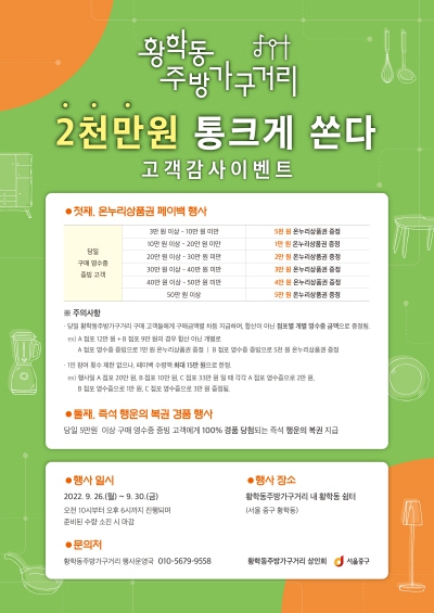 구 관계자는 “상품권과 복권은 주방가구거리 행사 참여 점포에서 당일 구매한 고객에 한해 지급되며, 구매 영수증을 가지고 황학 마을쉼터 행사 부스를 방문하면 이벤트에 참여할 수 있고 준비된 수량이 소진되면 조기 마감 될 수 있다”고 설명했다.