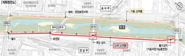 구 관계자는 “약 40억원이 투입될 이 공사는 녹색서울시민위원회 심의를 통과하면 내년 2월 착공해 8월 준공할 계획”이라고 밝혔다. 탄천의 자연을 더 가까이 즐길 수 있도록 벤치, 휴게쉼터, 전망대도 조성할 예정이다. 또 기존 자전거·보행자 겸용도로(4m)는 자전거 전용도로(양방통행)로 바꿔 사고 위험도 줄인다.