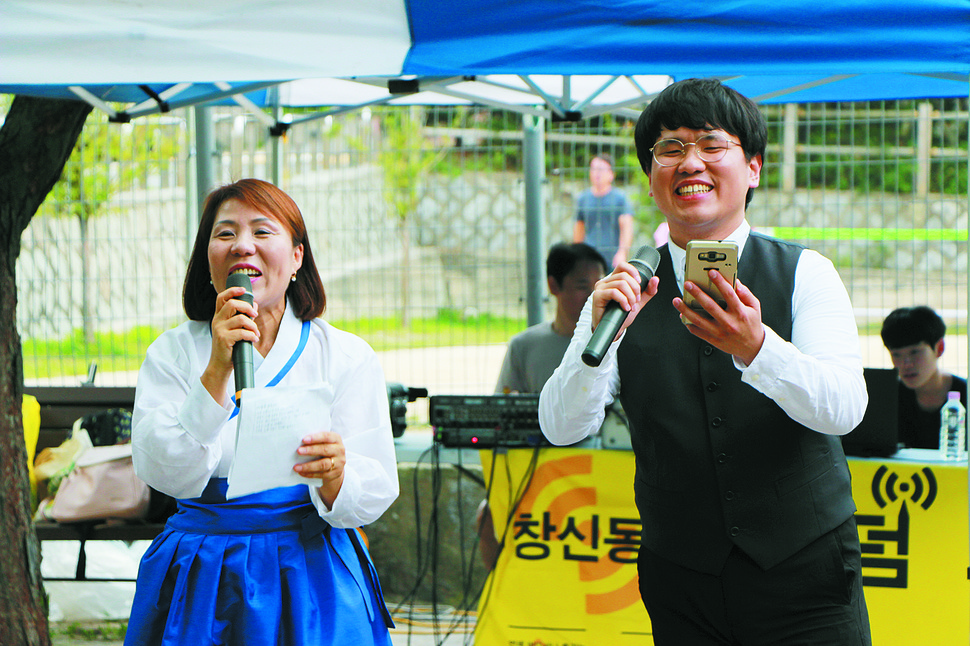 1 지난 7월 은행나루마을방송국이 도봉구 방학3동 주민센터 강당에서 주민들과 함께 개국기념 공개방송을 하고 있다.