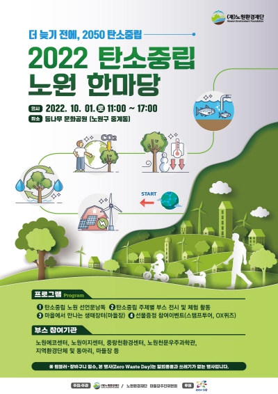 노원구가 10월 첫날 ‘2022 탄소중립 노원 한마당’을 연다. 노원환경재단이 주최하는 이번 행사는 노원에코센터, 노원EZ센터(Nowon Energy Zero Center), 중랑천환경센터 등 지역내 환경기관을 비롯해 환경단체, 환경동아리 등이 함께한다.