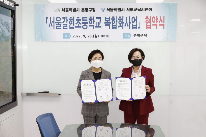서울갈현초등학교 복합화사업 협약식에서 김미경 은평구청장(왼쪽)과 이양순 서부교육지원청 교육장이 기념촬영을 하고 있다.