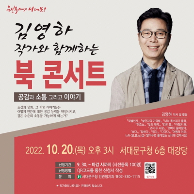 이번 북콘서트는 ‘공감과 소통 그리고 이야기’란 주제로 소설과 영화같은 이야기들이 어떻게 공감 능력을 확장시키고 소통을 가능하게 하는지를 다룬다. 이날 국악과 대중음악 공연도 펼쳐진다. 선착순 100명을 모집하며 관심 있는 누구나 서대문구 홈페이지 공지사항을 참고해 신청할 수 있다. 자세한 내용은 서대문구청 민관협치과(02-330-1115)로 문의하면 된다.