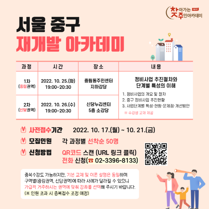 이번 수업을 통해 재개발 정비사업 추진절차와 단계별 특성에 관한 이해를 돕는다. 수강료는 무료이며 선착순으로 접수받는다. 교재도 제공된다. 신청은 전화(02-3396-8133) 또는 QR코드 스캔을 통해 가능하다.