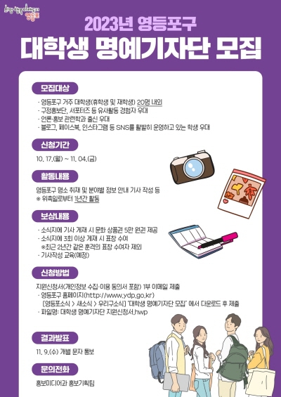 영등포구가 ‘대학생 명예기자단’을 다음달 4일까지 모집한다.