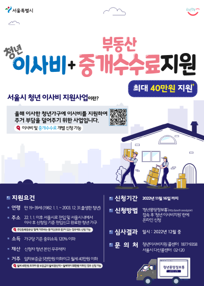 지원 대상은 연령 만19~39세의 청년이다. 올해 서울시로 전입하거나 서울시 내에서 이사 후 신청일 기준 전입신고를 완료한 청년에게 최대 40만원 한도 내의 실비가 지원된다. 신청액이 40만원을 넘지 않을 경우 중개수수료를 추가 신청해 지원 받을 수 있다.