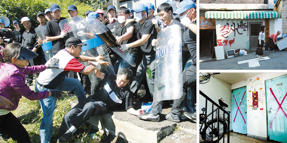 재개발 현장에서 용역업체 직원들과 시민들이 몸싸움을 벌이고 있다. 서울시는 지난달 29일 재개발 등 정비사업 과정에서 시민이 삶터와 일터를 잃고 거리로 내몰리는 일이 없도록 하겠다고 선언했다. <한겨레> 자료사진