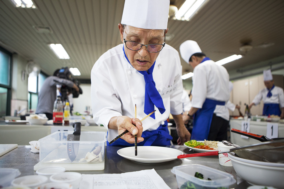 요리사 복장을 정갈하게 갖춰 입은 어르신들은 “천천히 하셔도 된다”는 진행자의 안내에도, 흐르는 땀을 제대로 닦지 못할 만큼 바쁘게 움직였다. 요리대회 참가를 위해 서너 번씩 연습한 요리인데, 실전에서는 예상치 못한 실수들이 튀어나왔다. 마음이 아직은 서툰 손보다 앞선 탓이다. 지난달 28일 양천구 서부여성발전센터에서 열린 제1회 시니어 요리대회 풍경이다.