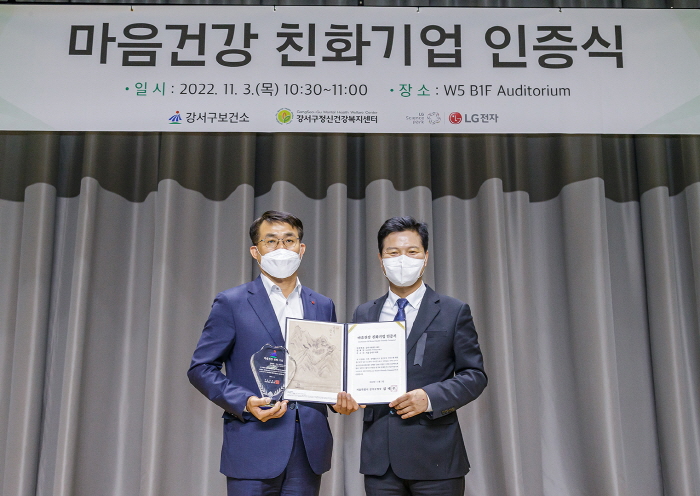 김태우 강서구청장은 3일 마곡지구에 위치한 LG사이언스파크를 찾아 ‘마음건강 친화기업 인증패’를 전달했다. 구는 강서구정신건강복지센터와 지난 5월부터 전국 최초로 지역 내 기업을 찾아가는 ‘2040 직장인 스(스트레스완화) 마(마음안정) 일(일상회복) 프로젝트’를 추진해왔는데 LG사이언스파크가 1호다. 코로나19 장기화로 인한 우울증, 스트레스, 사고 트라우마 등 각종 이유로 마음건강에 적신호가 켜진 직장인들을 적극적으로 돕기 위해서다.