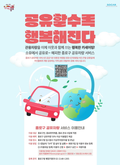 한편 종로구는 지난 8월, 쏘카와 업무협약을 맺고 교통문제 해결과 공유문화 활성화를 위해 함께할 것을 약속한 바 있다.