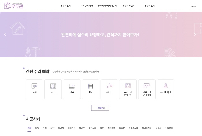 이번에 개설된 우주관 홈페이지는 크게 △우주관 소개 △간편 수리 예약 △집수리·인테리어 문의 △우주관 스토어 △우주관 소식 등으로 구성되어 있다.‘간편 수리 예약’을 이용하면 도배, 장판, 인테리어 등의 시공에 대해 전문가 방문 없이도 간단히 견적을 예상하고 예약까지 진행할 수 있으며, ‘집수리 인테리어 문의’를 통해 건축분야에 대한 궁금한 점을 자유롭게 상담받을 수 있다. 아울러 홈페이지 메인에는 다양한 시공사례가 공개돼 실제 공사 의뢰 시 참고할 수 있다.