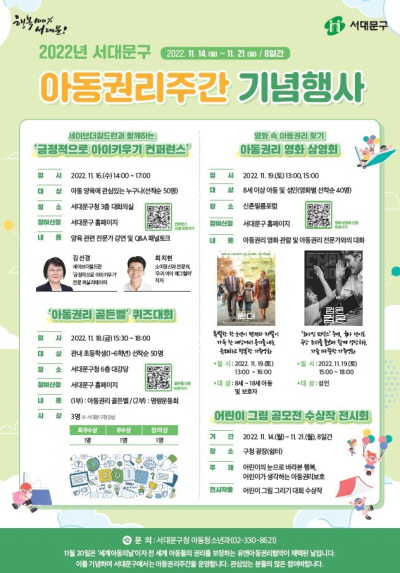 구는 아울러 21일 오후 4시 구청 대회의실에서 아동권리증진 유공자 표창식도 연다. 행사에 관한 자세한 내용은 서대문구청 아동청소년과(02-330-8621)로 문의하거나 구 홈페이지 공지사항을 참고하면 된다.