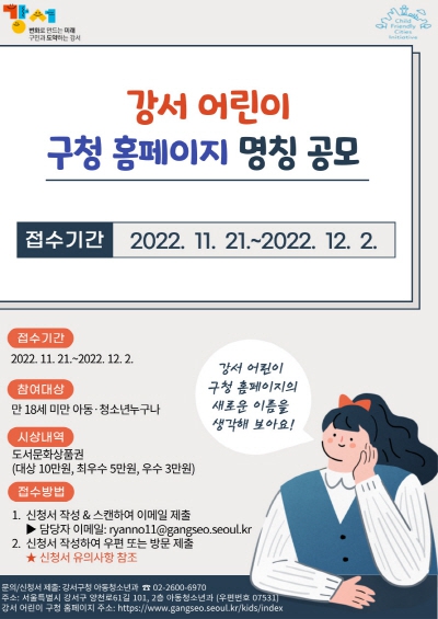 강서구가 어린이 구청 누리집 이름을 공모하고 설문조사도 진행한다.