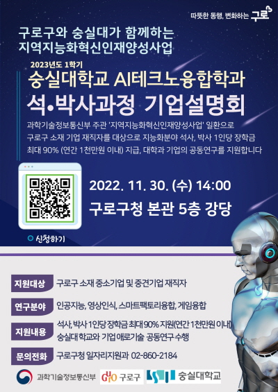 이번 설명회는 관내에 위치한 중소‧중견기업의 재직자에게 지역지능화혁신인재양성 사업의 취지와 숭실대학교 AI테크노융합학과 석‧박사 과정을 안내하기 위해 마련됐다. 박광영 숭실대학교 교수가 사업을 설명하고 질의응답하는 시간을 갖는다.