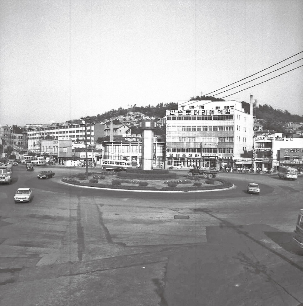 1969년 당시 신촌로터리와 시계탑 전경. 뒤로 한일은행과 신촌로터리 예식장이 보인다.