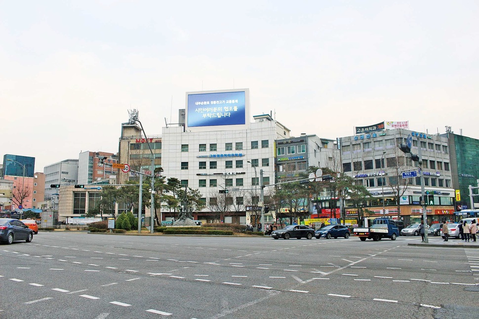 2016년 현재 신촌오거리 전경. 한일은행은 우리은행으로 바뀌었고 신촌로터리 예식장은 새로운 이름의 예식장으로 바뀌었다. 서울시, 기억발전소 제공