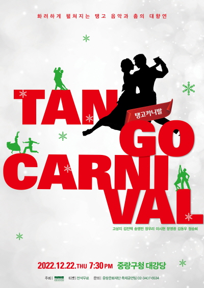 중랑문화재단이 주최하는 ‘탱고 카니발’ 공연이 22일 저녁 7시30분 중랑구청 대강당에서 열린다. 이번 공연은 아스토르 피아졸라의 ‘리베르탱고’ ‘망각’ ‘거리의 탱고’와 영화 <여인의 향기>에 삽입된 카를로스 가르델의 ‘포르 우나 카베사’를 만날 수 있다. 또 ‘크리스마스 메들리’도 마련돼 있다.