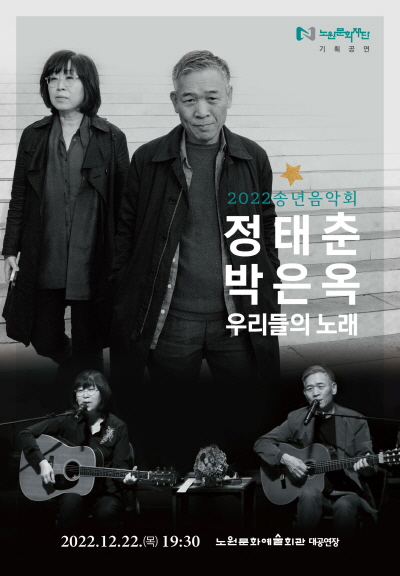 노원문화재단이 송년음악회와 연극을 선보인다. 먼저 22일 7시30분에는 송년음악회 ‘정태춘 박은옥-우리들의 노래’가 노원예술회관 대공연장 무대에 오른다. 이날 공연에서는 대표곡인 ‘회상’ ‘시인의 마을’ ‘떠나가는 배’ ‘서해에서’ 등을 노래한다.
