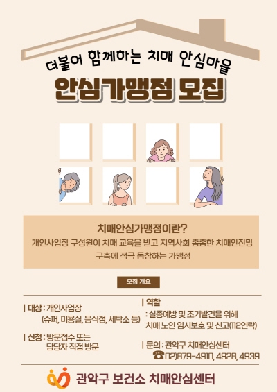 관악구가 ‘우리마을지킴이 치매안심가맹점’을 운영하고 있다. 치매안심가맹점은 일상생활에서 자주 이용하는 슈퍼마켓, 미용실, 음식점, 카페, 약국 등의 상점 구성원들이 치매파트너 교육을 받아 치매가 의심되고, 배회하거나, 실종 어르신 발견 시 임시 보호와 신고를 통해 경찰과 보호자에게 인계하는 역할을 한다. 또 치매극복활동 독려 및 모니터링, 치매 부정적 인식 개선과 지역사회 치매 돌봄 문화 확산을 위한 자원봉사 등 다양한 활동을 펼친다.