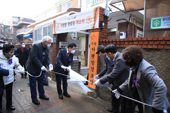 구로구가 21일 ‘수궁동 아랫말 경로당’ 개소식을 갖고 운영에 들어갔다. 부일로11길 4-3(궁동)에 위치한 아랫말 경로당은 연면적 86.68제곱미터, 지상 2층 규모로 기존 경로당을 리모델링했다. 구는 추위를 막기 위해 경로당 내 이중창과 창 가림막을 설치하고 낡은 화장실과 부엌은 보수하거나 전면 교체했다. 내부 도배, 장판 교체, 지하방수와 지붕 공사 등도 함께 진행했다. 앞서 구는 지난 8월 구로5동 새말경로당을, 11월 개봉1동 양송이경로당을 신설했다.