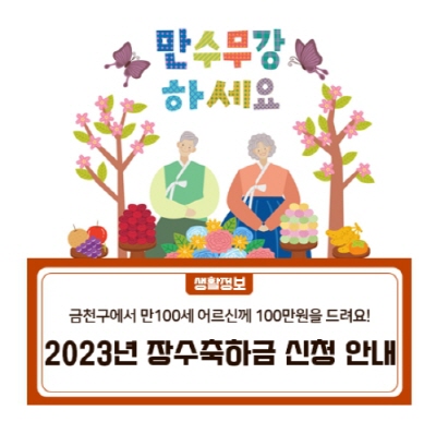금천구가 ‘장수축하금’ 100만원을 지급한다. 구는 2020년 9월 관련 조례를 제정해 장수축하금 지급에 대한 근거를 마련했다.