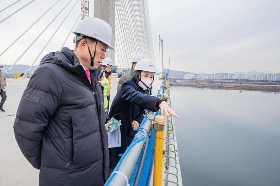 (가칭)고덕대교 공사현장을 검검하는 이수희 강동구청장 모습. 강동구청 제공