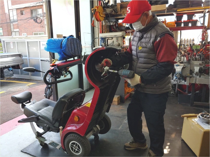 성동장애인종합복지회관 이동보조기기 수리센터에서 전동휠체어를 수리하고 있는 모습. 성동구청 제공
