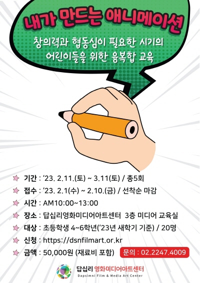 교육은 11일부터 한 달 간 모두 5회 진행된다. 참여자들은 1인당 1편의 애니메이션을 제작하고 상영회도 연다. 20명을 모집하고 있으며, 교육비는 재료비를 포함해 5만원이다. 참여를 원하는 초등학생은 10일까지 답십리영화미디어아트센터누리집(dsnfilmart.or.kr)을 통해 신청하면 된다.