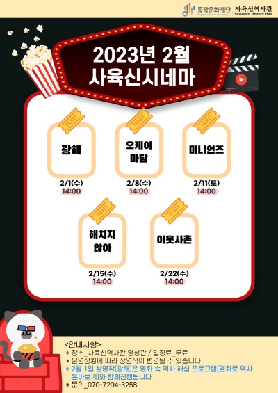 동작구가 22일까지 사육신역사공원 내 사육신역사관에서 ‘사육신시네마’를 운영한다. 사육신시네마’는 △수요극장(매주 수요일 오후2시) △토요극장(매월 둘째 주 토요일 오후 2시)으로 나눠 진행한다. 이달은 지난 1일 <광해>를 시작으로 △오케이 마담(8일) △미니언즈(11일) △해치지 않아(15일) △이웃사촌(22일)을 상영한다.