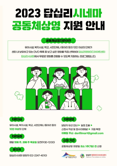 동대문구 답십리영화미디어아트센터가 10인 이상 단체나 기관을 대상으로 무료로 영화를 관람할 수 있는 기회를 마련했다. 유아시설·복지시설·학교 등 관내 10인 이상의 단체가 센터 보유 DVD 영화 목록 중 보고 싶은 영화와 상영일을 선택하면 무료로 관람할 수 있다.