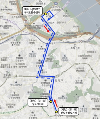 이번에 신설된 버스는 신림동 별빛사거리에서 보라매병원, 신대방삼거리, 서울공업고등학교, 서울지방병무청 등을 경유해 여의도환승센터까지 10분 간격으로 하루 15회 운행된다. 운행 시간은 출근이 집중되는 평일 아침 6시30분부터 9시까지다. 단, 토·일요일과 공휴일에는 다니지 않는다.