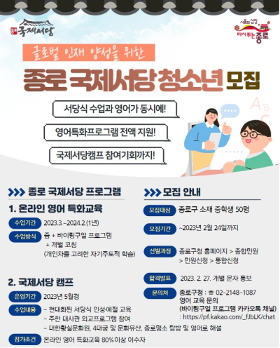 종로구가 24일까지 ‘종로 국제서당’ 참여 중학생을 모집한다. 종로 국제서당은 ‘영어’ 교육과 청년 멘토링을 제공한다.