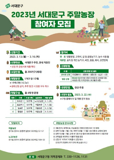 주말농장 운영과 신청에 대한 자세한 내용은 구 누리집 공지사항을 참고하거나 서대문구청 지역경제과(02-330-1126)로 문의.