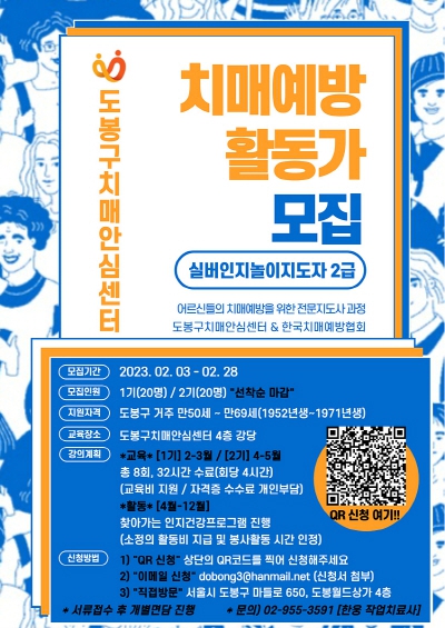 교육신청은 평소 치매에 관심있는 구민(50~70세)이면 누구나 가능하며, 홍보포스터 내 QR로 신청하거나 도봉구 치매안심센터 누리집에서 신청서를 내려받아 작성 후 전자우편(dobong3@daum.net)으로 제출하면 된다. 직접방문(도봉구치매안심센터)도 가능하다.