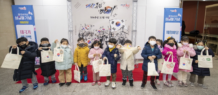용산구가 21일 오전 10시부터 오후 5시까지 용산아트홀 지하1층 전시실 앞에서 제104주년 3·1절 기념 체험부스를 운영했다. 체험부스에서는 스탬프와 배지 등을 활용해 태극기 에코백, 거울을 만드는 작업이 이뤄졌다. 체험시간은 약 30분 정도로, 용산구 직장 어린이집 원아들도 참여해 직접 태극기 에코백을 만들었다.