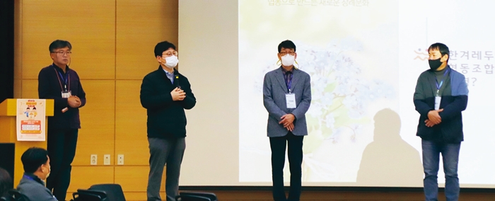 지난해 12월 ‘2022 사회적경제활동가대회’에서 사회적경제 공동행동에 대한 제안이 있었다. (왼쪽부터) 하재찬 한국사회적경제연대희의 상임이사, 강민수 서울시 협동조합지원센터장, 이창환 한겨레두레협동조합 대표, 이승석 한국사회적경제연대회의 상임대표.