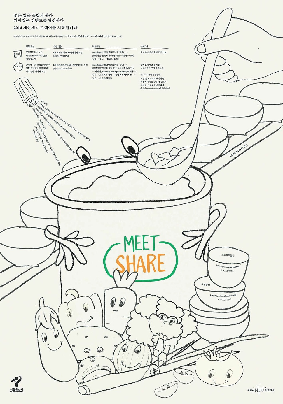 ‘미트쉐어’(meet+share)는 더 나은 사회를 꿈꾸는 공익활동가들이 더 쉽고 즐겁게 활동할 수 있도록 누리집 등의 플랫폼과 모임비를 지원하는 시민공익활동 지원사업이다. 좋은 일을 즐겁게 하고, 의미있는 콘텐츠를 확산시키기 위해 공익활동을 하려는 사람들의 모임과 새로운 공익 프로젝트를 지원한다. 모임형에는 30만원, 실행형에는 150만원이 활동비로 지원된다. 3명 이상의 개인이나 단체가 유형을 정해 신청하면 공익성 등 심사를 거쳐 지원을 받고 활동 결과물을 정리해 제출해야 한다. 모집기간이 따로 없어 언제든 신청할 수 있다. 단, 모임형은 모임을 하기 1주일 전에는 신청을 해야 한다. 오는 24일 엔피오지원센터에서 올해 미트쉐어 사업설명회가 열린다.