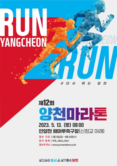 양천구가 8년 만에 마라톤 대회를 다시 연다. 5km, 10km, 하프 3개 코스로 진행되는 이번 마라톤 대회는 5월13일 안양천 일대에서 열린다. 참가자 접수기간은 3월3일부터 4월26일까지며, 접수 전용 누리집(www.ycmarathon.co.kr)에서 온라인 선착순 신청 받는다. 참가비는 하프와 10km 코스는 3만원, 5km 코스는 1만원이다. 기능성 티셔츠, 슬링백(가방) 등 다양한 기념품도 마련될 예정이다.