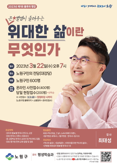 강연에 참여를 원하는 주민은 온라인 또는 현장 접수가 가능하다. 구 누리집에서 다음달 3일부터 온라인으로 400명을 사전 접수하며 당일 오후 6시부터 선착순 200명 입장가능하다. 좌석은 지정석 없이 자유좌석제다. 현장 참여가 어려운 주민은 구 공식 유튜브 채널 ‘노원구청 미홍씨’를 통해 실시간 강연을 들을 수 있다.