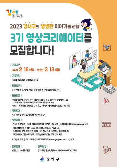 강서구가 ‘2023년 3기 강서영상크리에이터’를 모집한다. 구는 다음달 13일까지 개인 또는 단체(4인까지) 10팀을 모집하며 강서구에 거주 중이거나 강서구 소재 학교, 직장에 다니는 누구나 지원할 수 있다.