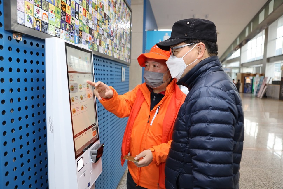 금천구청 1층 로비 키오스크 체험존에서 주민들이 햄버거 주문 연습을 하고 있다. 금천구 제공