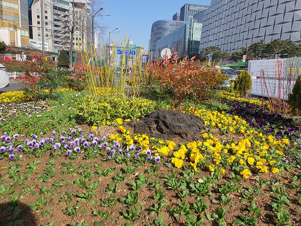 잠실역 사거리 교통섬에 조성한 봄철 테마화단. 송파구 제공