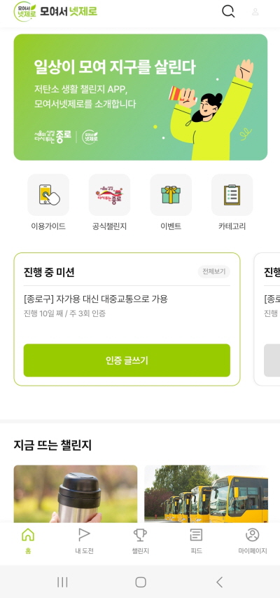 종로구가 주민들의 저탄소 생활 실천 앱 ‘모여서 넷제로’를 내놨다. 앱을 통해 탄소를 줄이기 위해 누구나 생활 속에서 손쉽게 참여할 수 있는 각종 챌린지를 진행하고, 그간 여러 포털에 흩어져 있던 저탄소 생활 실천 정보를 공유할 수 있다.