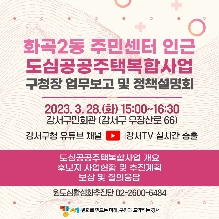 강서구가 주민을 대상으로 도심공공주택복합사업 정책설명회를 연다. 28일 오후 3시 강서구민회관 우장홀에서 열리는 이번 설명회는 구청장이 직접 프레젠테이션을 할 예정이며, 사업시행자인 LH 서울본부의 관계자가 화곡2동 주민센터 인근 도심공공주택복합사업 추진을 위해 사업추진 방향, 현안사항, 보상, 교통처리계획 등 전반적인 내용과 절차를 설명하고 질의응답 시간도 갖는다. 강서구청 공식 유튜브 채널 i강서TV를 통해 실시간 생중계도 한다.